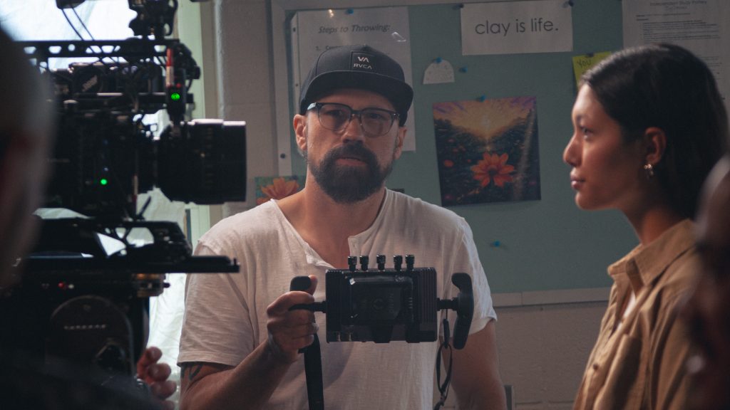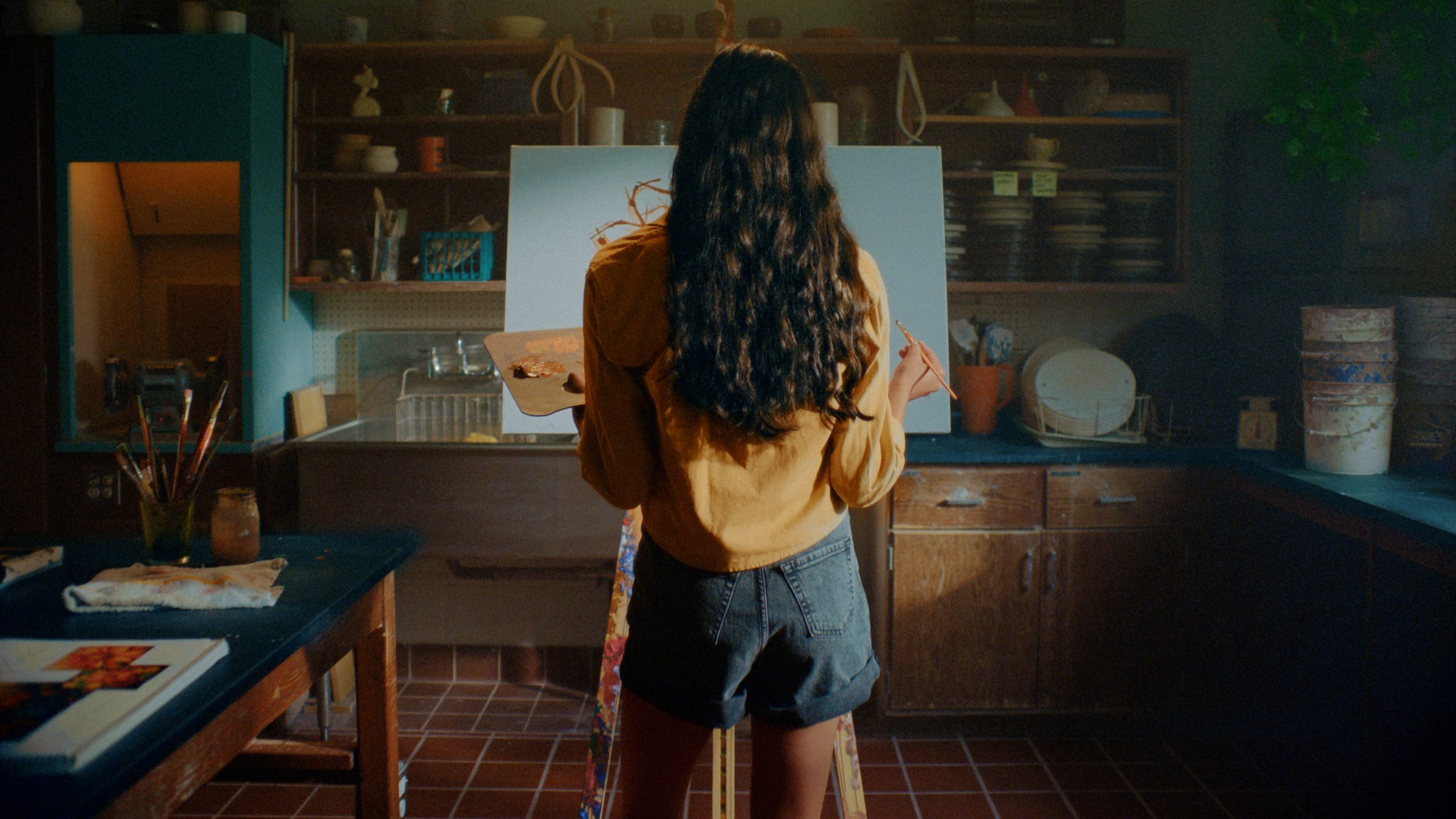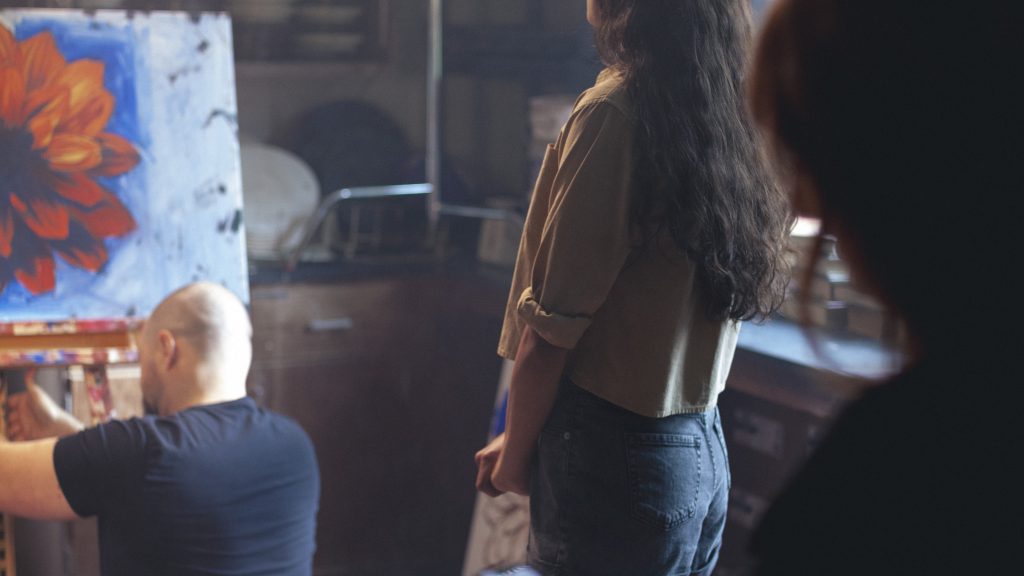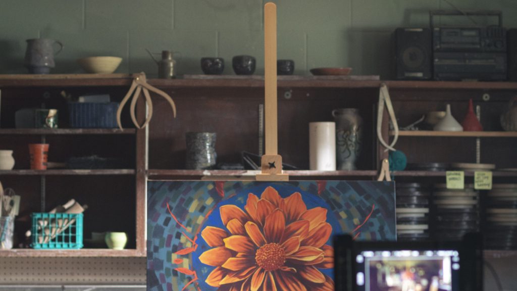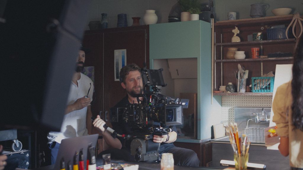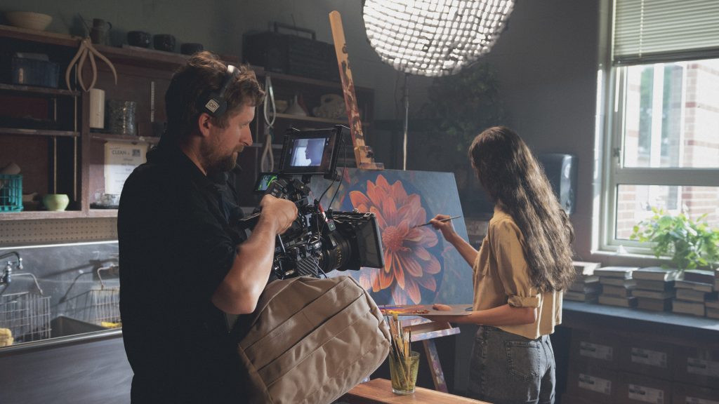 To your right, Tyler Grimm and Cassidy Bisher are meticulously crafting a suspenseful push-in camera shot. The camera tilts up, focusing on the paintbrush held by Isell – a young artist caught in a pause, reflecting on her next stroke and metaphorically, her next move in life.