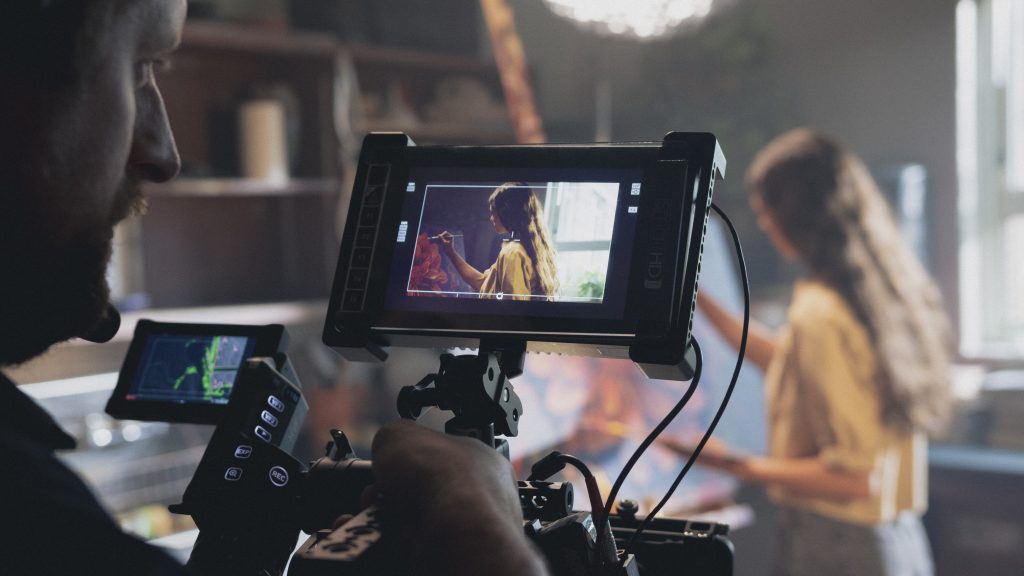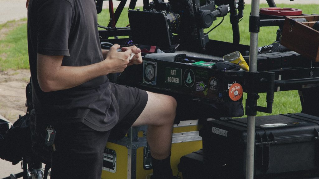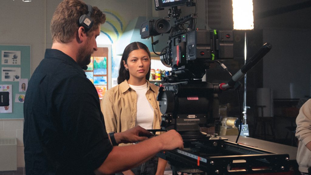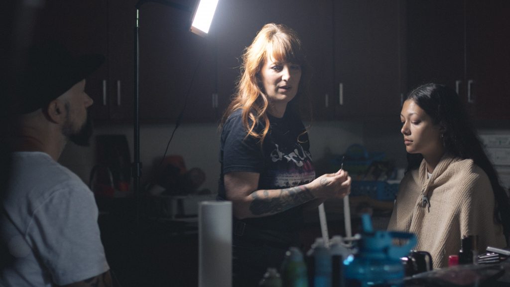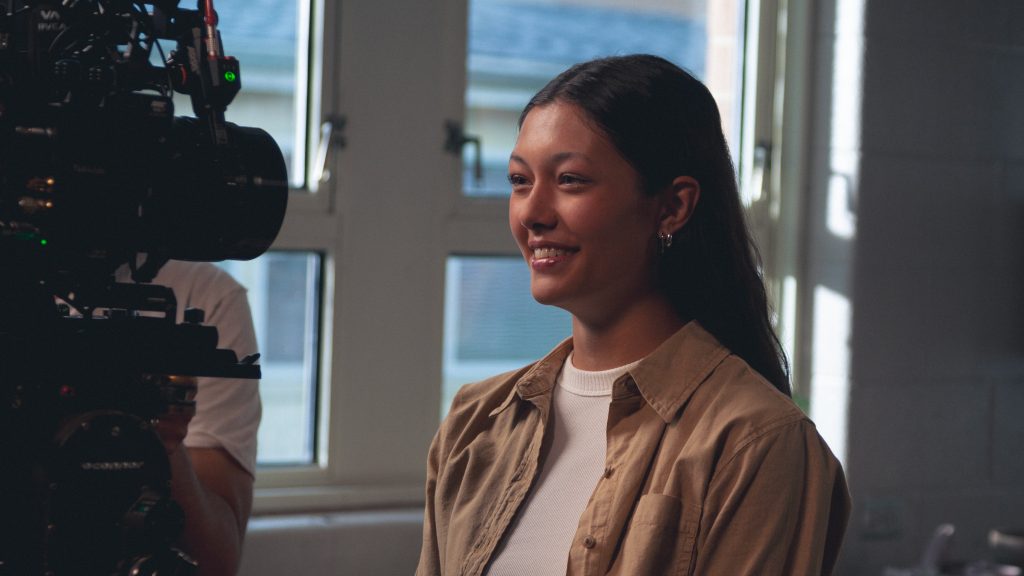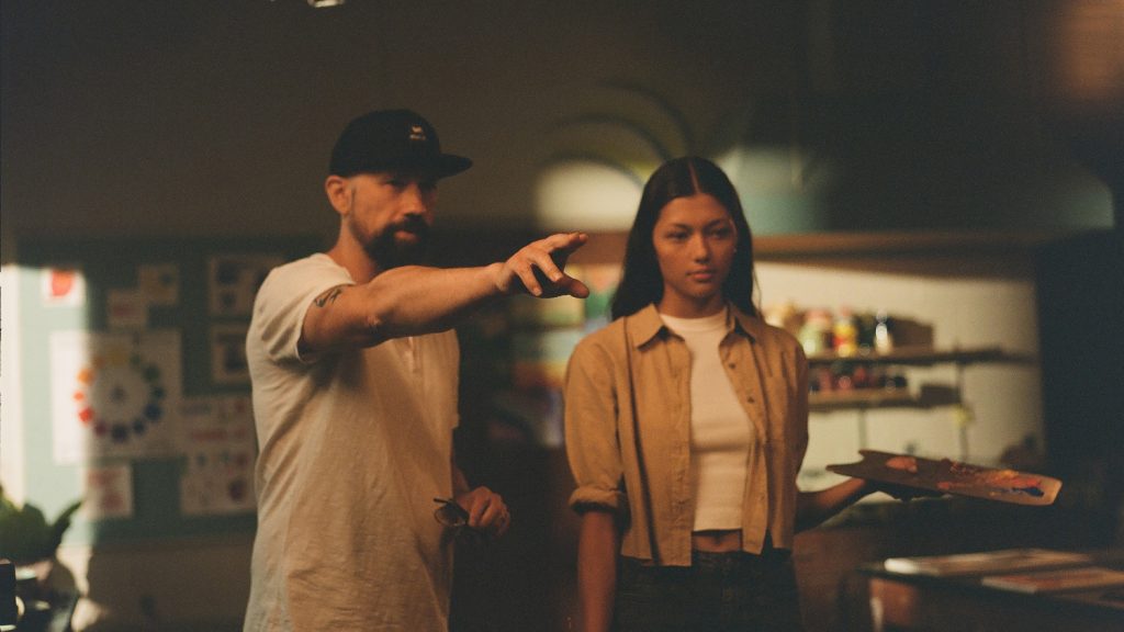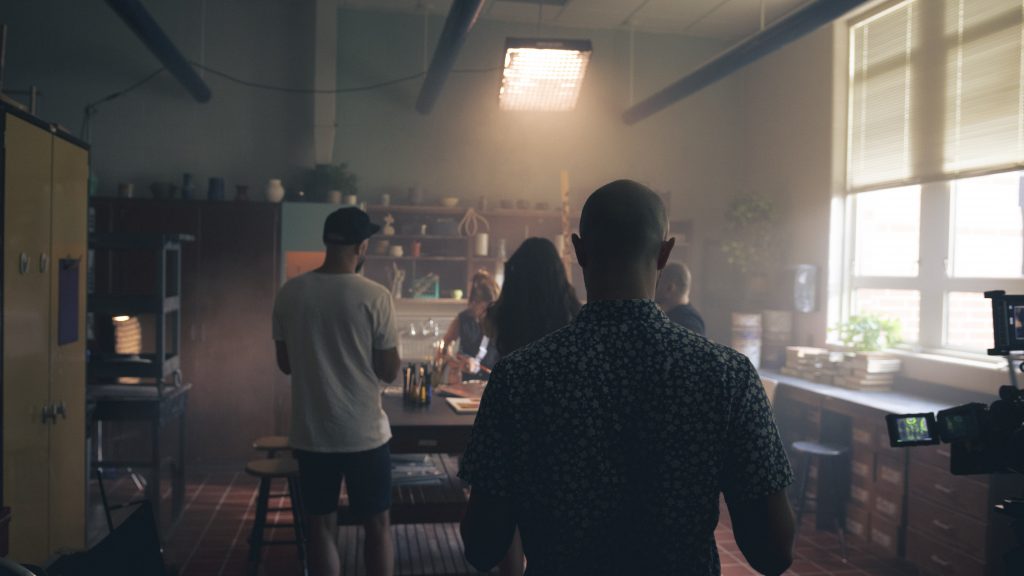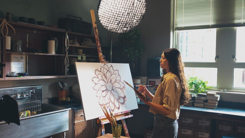 To your right, Tyler Grimm and Cassidy Bisher are meticulously crafting a suspenseful push-in camera shot. The camera tilts up, focusing on the paintbrush held by Isell – a young artist caught in a pause, reflecting on her next stroke and metaphorically, her next move in life.
