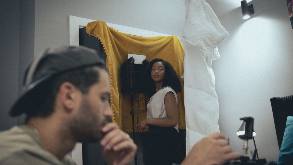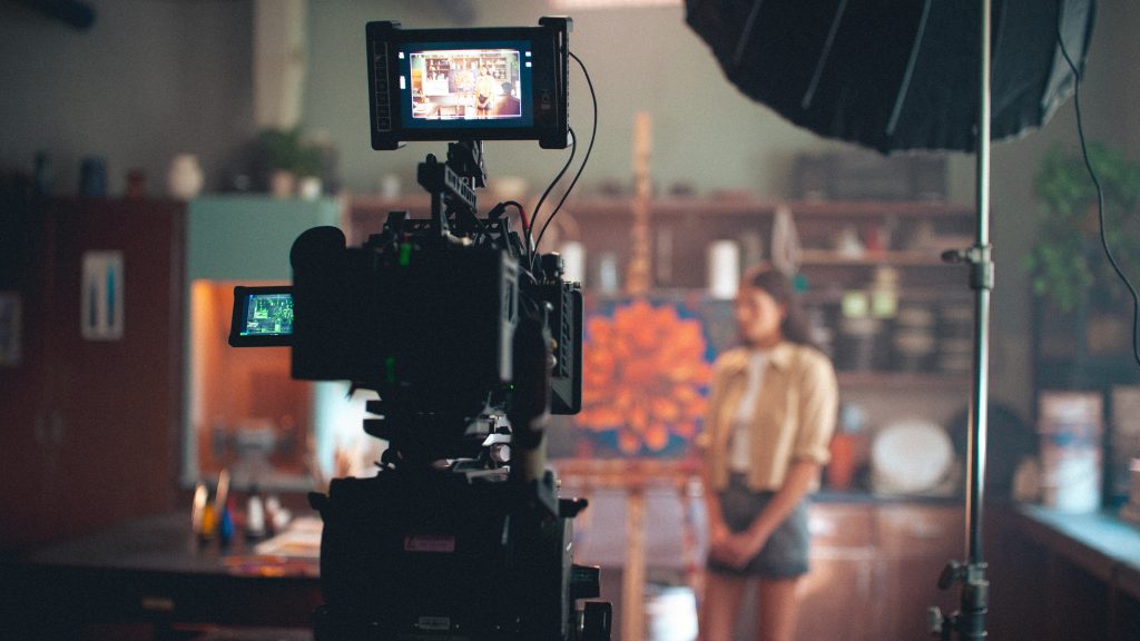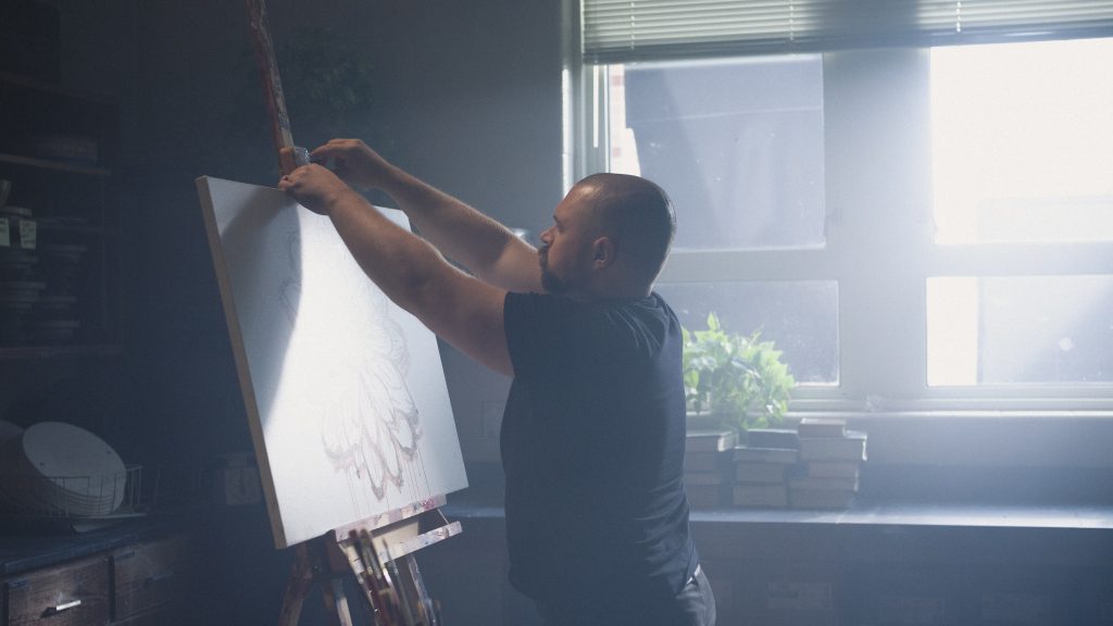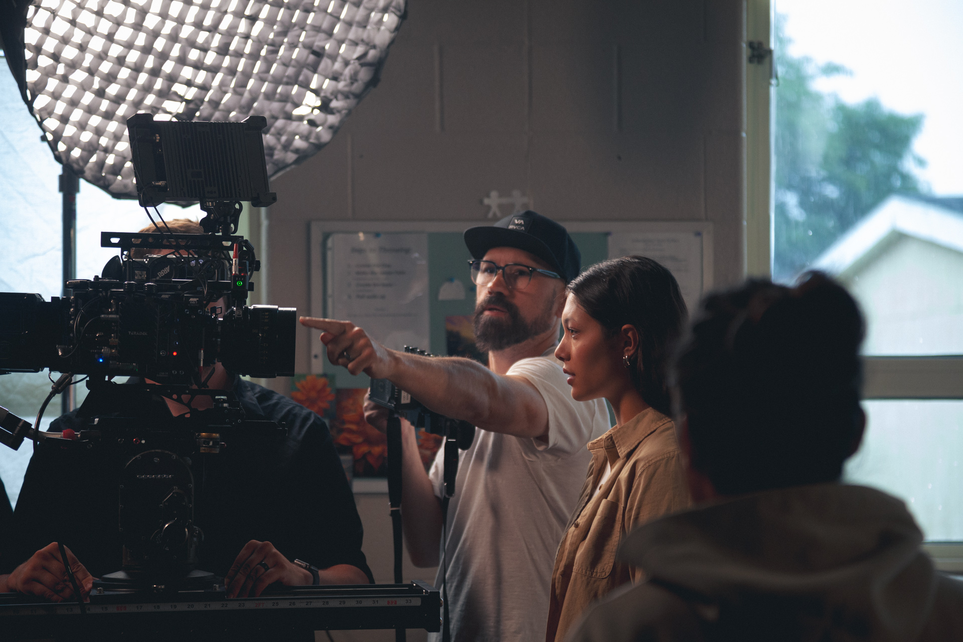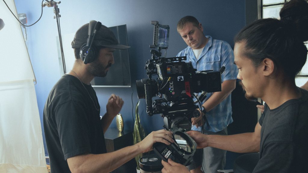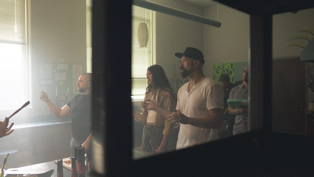 To your right, Tyler Grimm and Cassidy Bisher are meticulously crafting a suspenseful push-in camera shot. The camera tilts up, focusing on the paintbrush held by Isell – a young artist caught in a pause, reflecting on her next stroke and metaphorically, her next move in life.