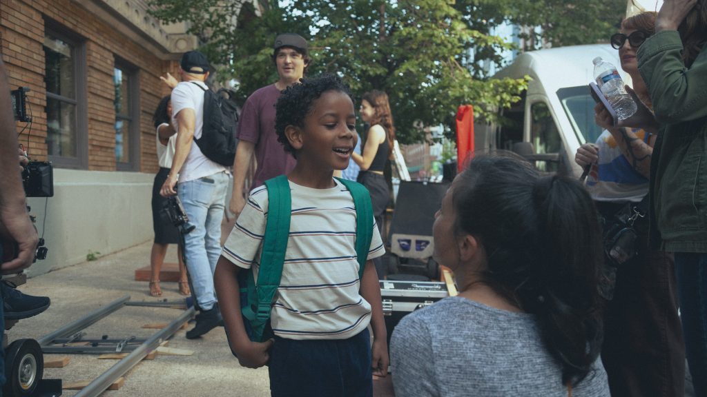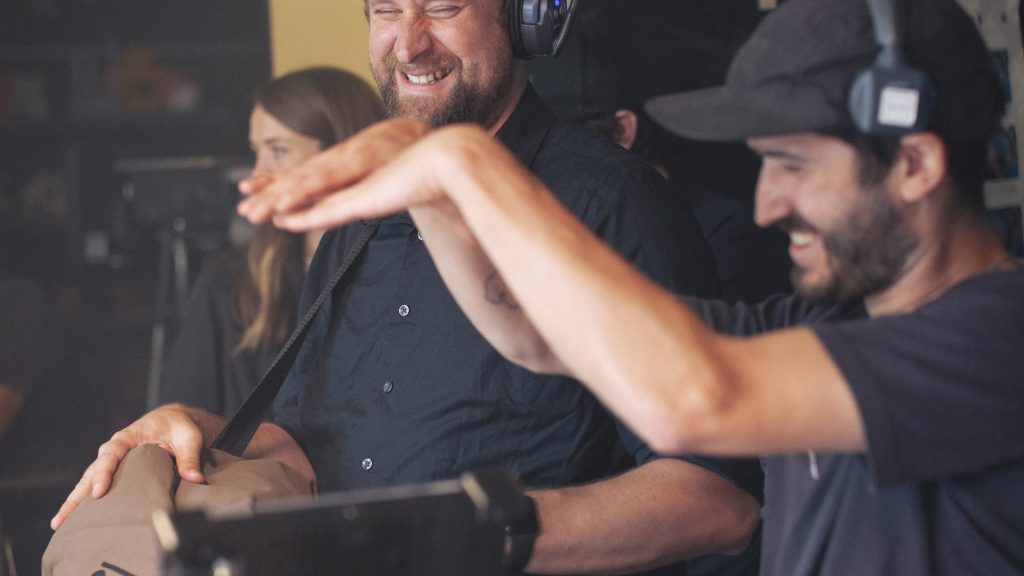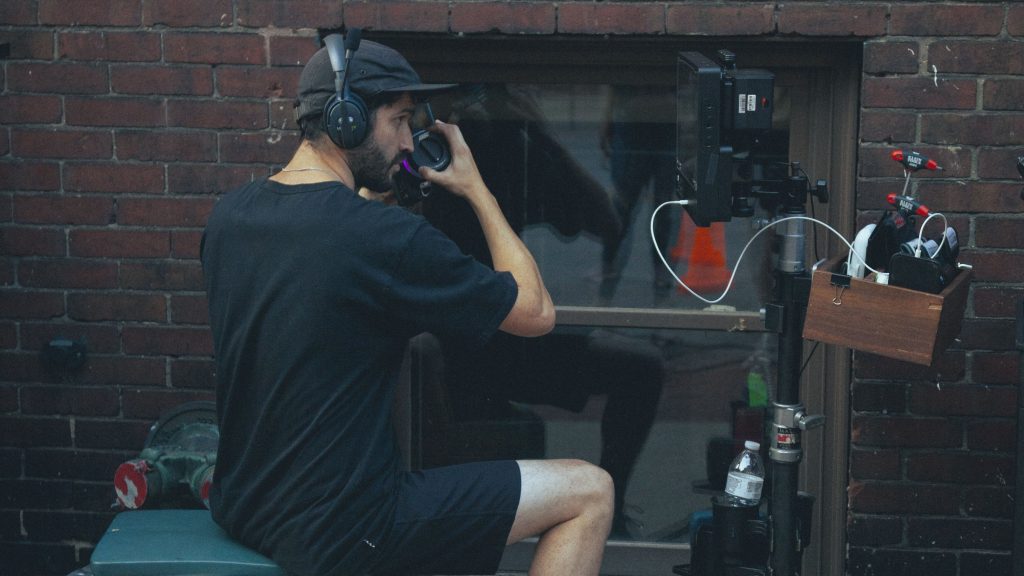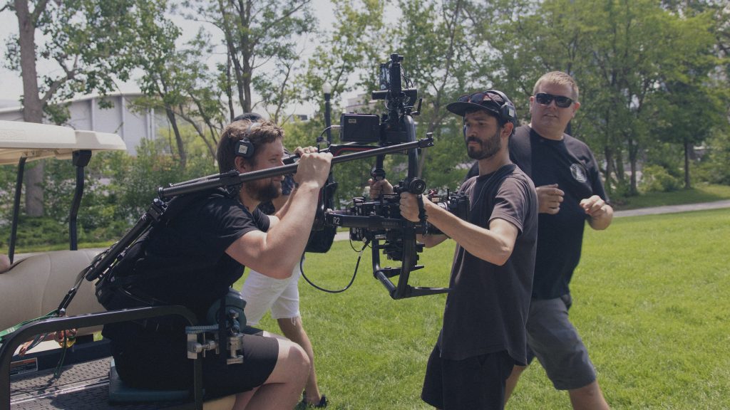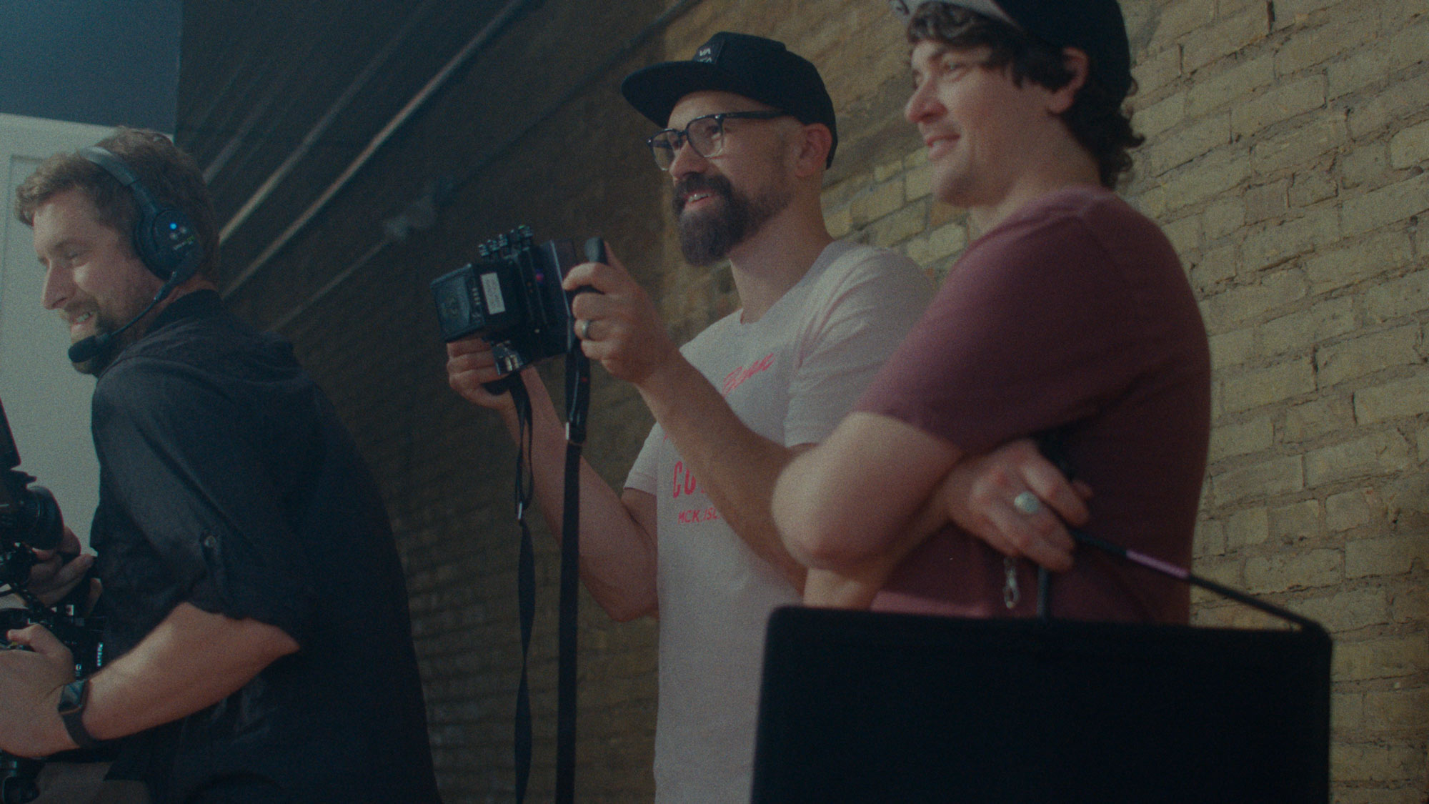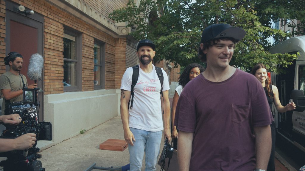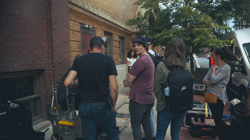 The crew gathers around as Kaitlin Larsen, portraying Anna, prepares to deliver her pivotal line. Tyler Grimm steadies the Ronin stabilizer, ensuring a smooth push-in shot that captures Anna’s determination. The camera glides forward, framing her against the vibrant cityscape, amplifying her strength and resolve.